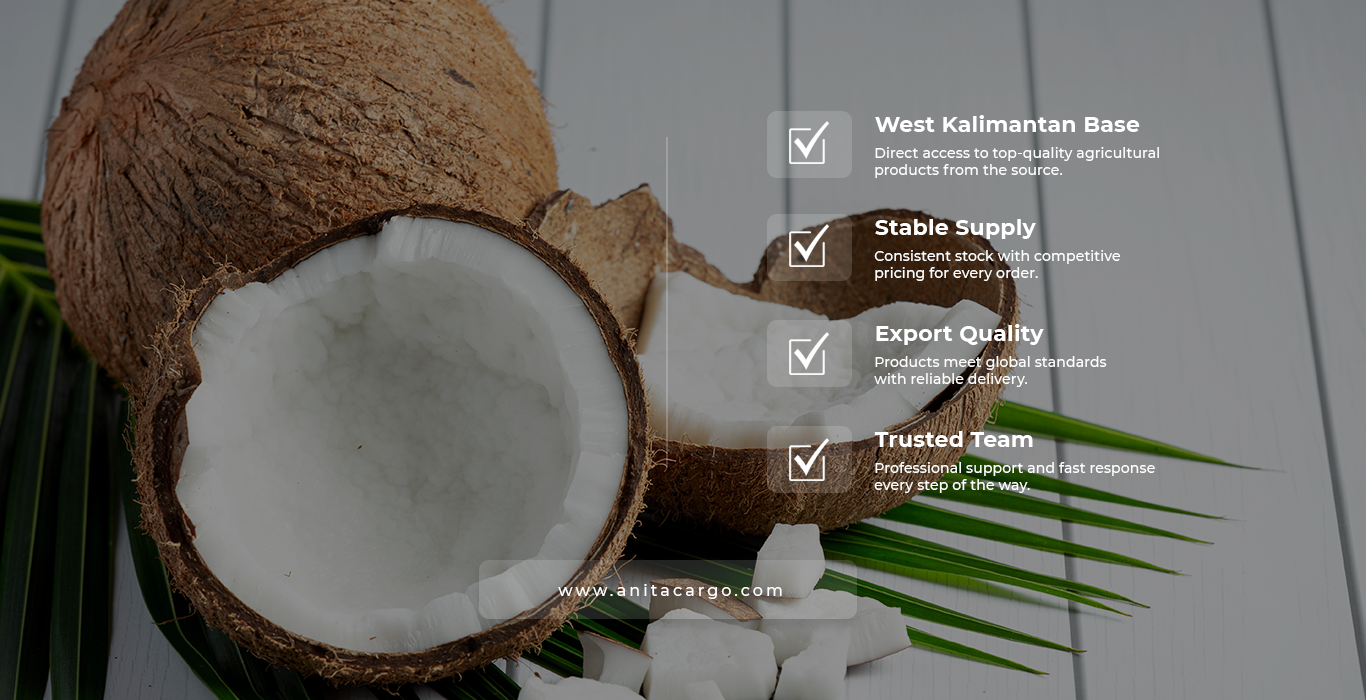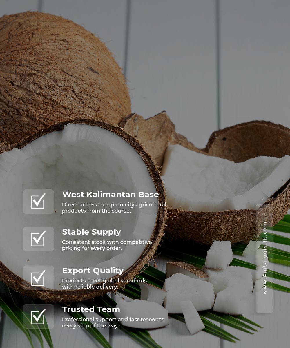 With a strong commitment to quality and sustainability, Anita Logistik works closely with local farmers and producers to ensure every product we deliver meets international export standards. Whether you are looking for raw coconut products, dried coconut shells, or high-grade charcoal, we are ready to serve your needs with efficiency and integrity.